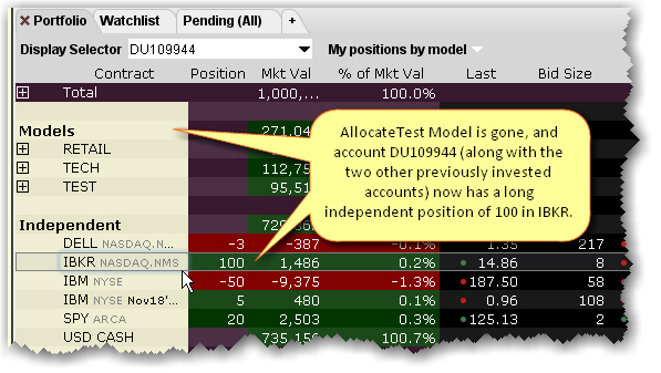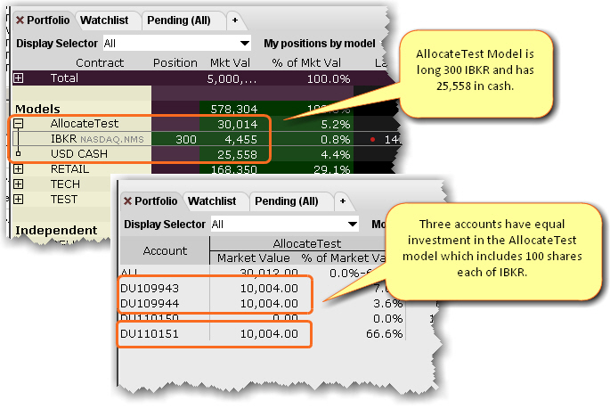 在模型中投资的客户的模型资产变成“独立的”头寸,并按其在模型中持有的比例。在以下举例中,三个账户之间持有的资产是均等的。