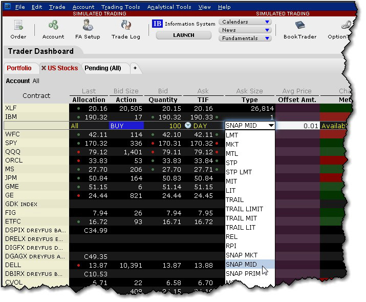 跳至中点单 (SNAP MID) 和挂钩定单类似,即原始定单价格是由当前的买/卖价加或减一个抵消额确定的。但和挂钩定单价格不同,“跳至”定单价格不随价格的变化而继续挂钩。