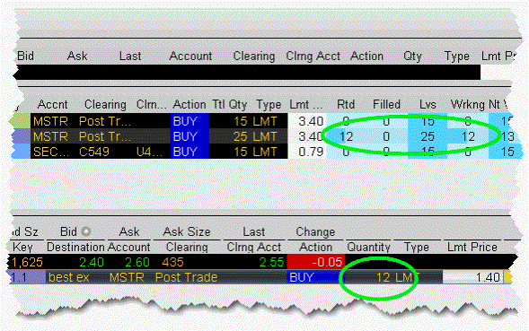 被发送至远离的交易所的定单数量显示在标签面板的定单状态栏中。在以上举例中,数量12 被传递到best ex远离交易所。状态显示传递了12个、剩余25个、以及工作中12个。