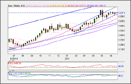 Gold closed positively last week, having bounced off support from the bottom of the long-term up-channel. As such, the metal has opened back in its recent trading range. The stochastics and RSI are very much neutral, whilst the metal is consolidating on support from the 5WMA. Our view on gold is as follows: having bounced off the bottom of the up-channel last week prices could look to challenge overhead resistance. However, whilst it remains in this well subscribed four week trading range ($1,503-$1,544), we will remain neutral.