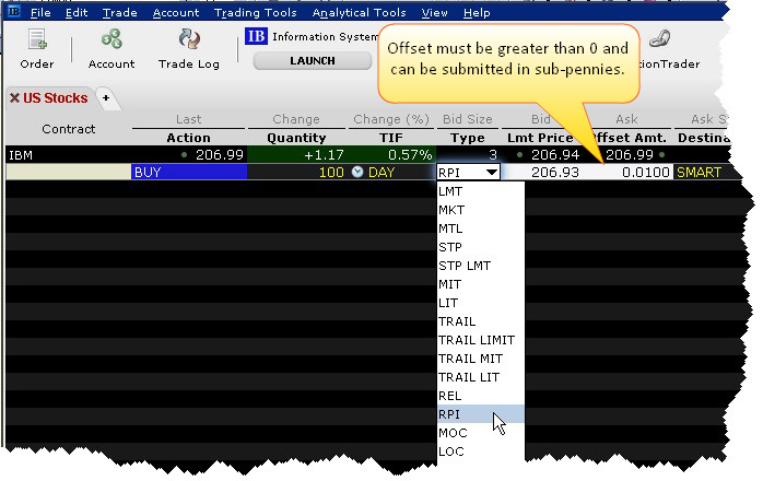 如果没有在定单类型列表中看到RPI,需要确定您的目的地设置的是SMART和股票是在NYSE或NASDAQ上挂牌交易的。