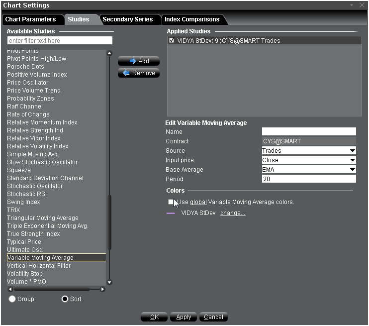 这是一个根据市场波动率调整其平滑常数的指数移动平均。其敏感度随数据的波动率增加而增加。通过随市场条件的改变使用波动率指数(VI)调整平滑期间,这个指数移动平均的表现得到改进。