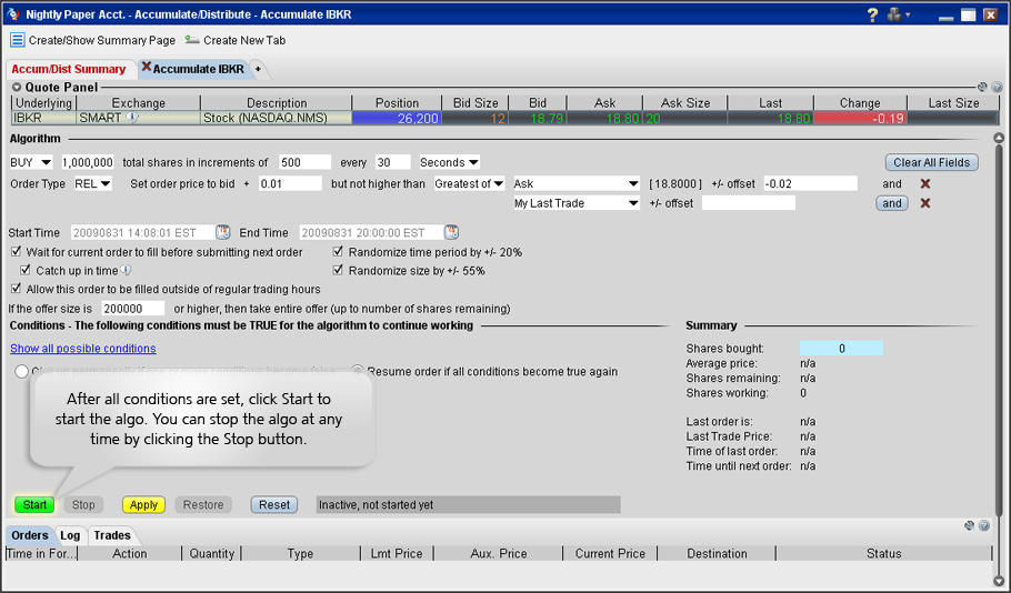 积累/分配算法能够帮助您在不被市场注意到的情况下以最佳价格交易大宗委托单,并能被设置用于高频率交易。通过将您的委托单切分为较小数量被随机化的委托单层级(这些层级在用户定义的时间段内以随机的时间间隔被释放),该算法允许在不被市场探测到的情况下交易股票和其他产品的大额委托单。该算法支持限价、市价和相对委托单类型。当您下达一笔相对委托单时,您必须指定它与什么相对,此处您有很多选择。当然,如果委托单相对的是一个固定值,那么该委托单实际上是一个限价单。您能使委托单与这样一些数值相对,如主导的买价、卖价、最后价、VWAP或移动VWAP、滑动平均或指数滑动平均、您的最后交易价或到目前为止已经买入的股数。有很多种可能性。