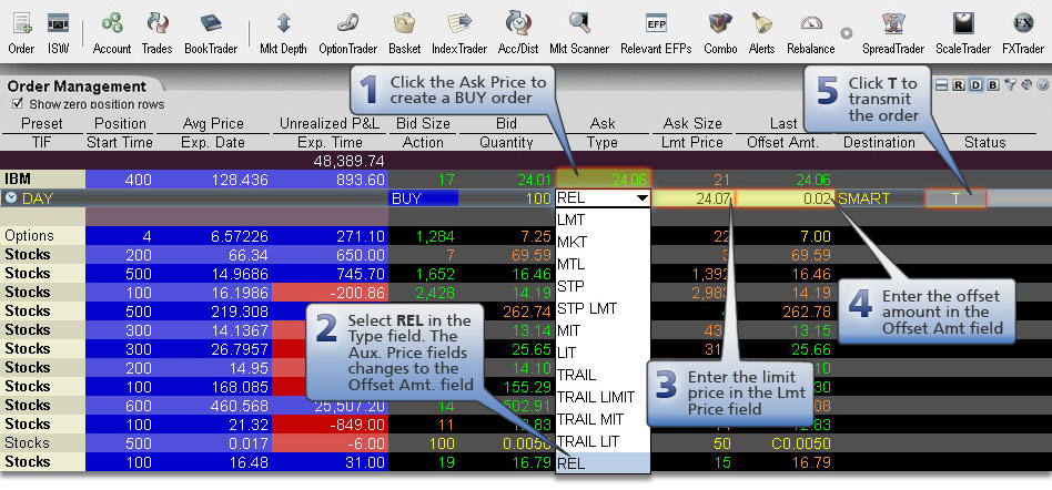 XYZ股票当前的全国最佳买卖价为$24.01 - 24.06。您首先创建了100股的买单并选择REL作为定单类型。然后输入限价24.07,该价格是定单的价格上限,也是您愿意支付的最高金额。随后,您可输入抵消额0.02,然后传递该定单。