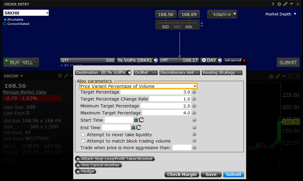 一种动态的单一定单委托单策略,其会根据用户设定的定价层级更改行动和激进程度。可设置具体的POV率、“I Would”暗池设置以及扫架价格。